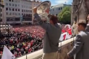 体育资讯5月18日讯 拜仁官推今天晒出了凯恩在夺冠庆祝活动中举起沙拉盘的视频,这位英格兰射手接受了球迷的欢呼。