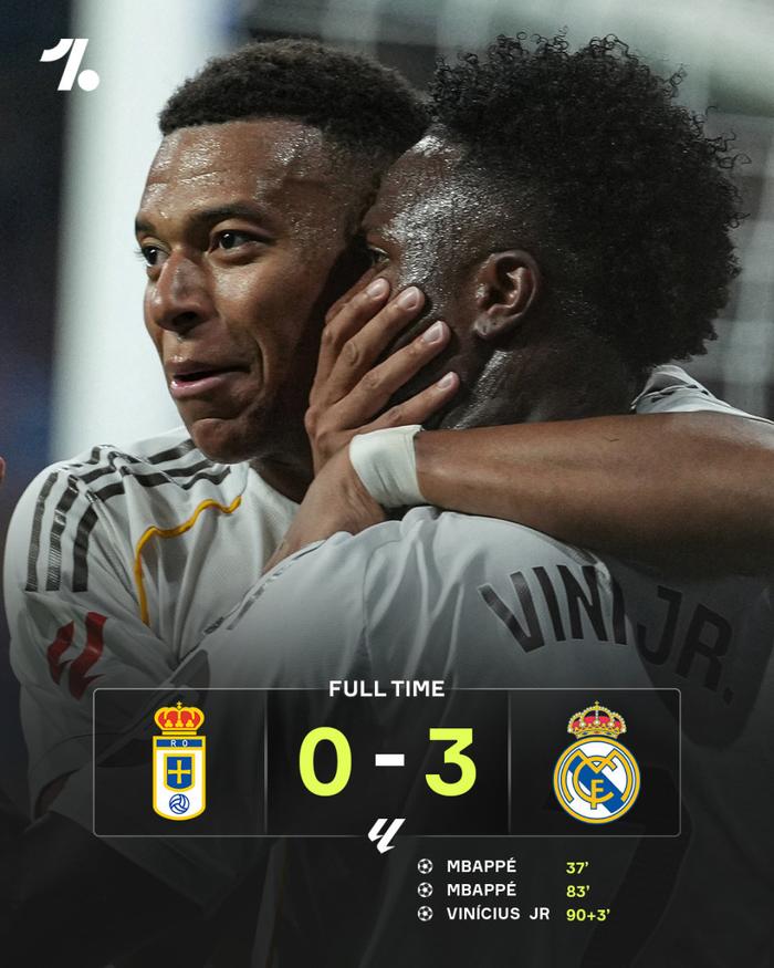 西甲第2轮,皇马客场3-0击败奥维耶多,开局两连胜。居莱尔助攻,姆巴佩梅开二度,维尼修斯补时破门传射建功。【详情】